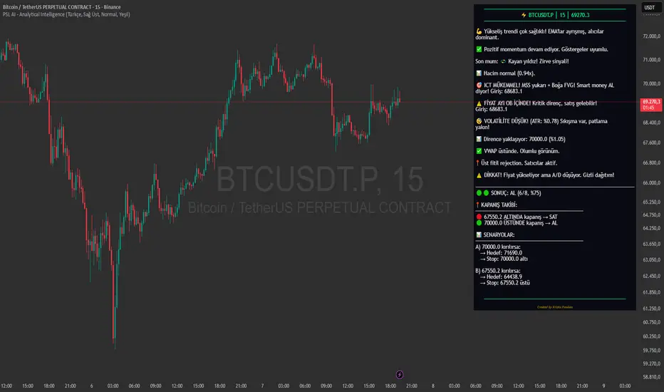 PSL AI (Analytical Intelligence) is a comprehensive real-time market analysis assistant that transforms complex technical data into human-readable commentary. Instead of displaying raw numbers, this indicator interprets 19 different analysis modules and presents actionable insights in natural language.