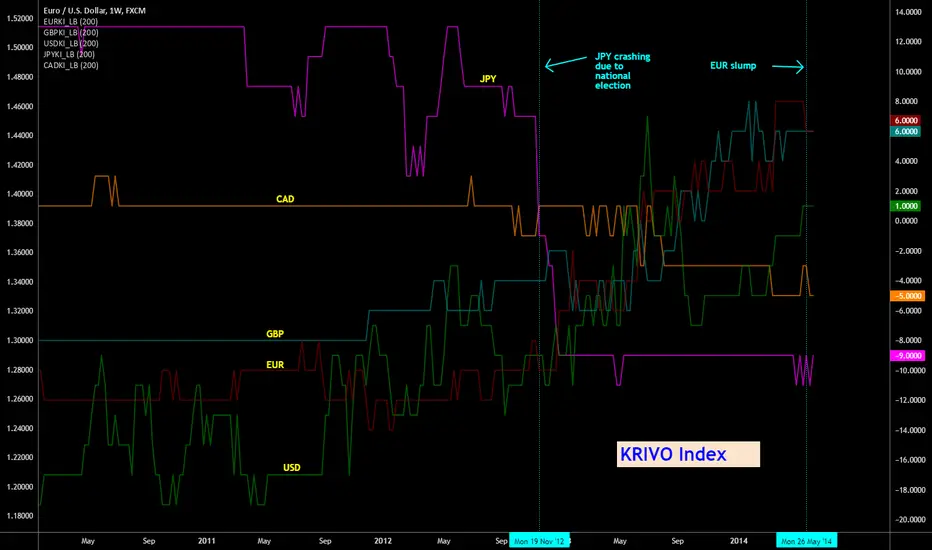 Krivo index, suggested by Richard Krivo, tries to quantify the "strength" of a currency by checking how many of its pairs are trading strongly (close above 200sma). As you can see from the chart, KI gives an excellent overview of their strength. Note how it correctly points out the JPY crash (Nov 2012).