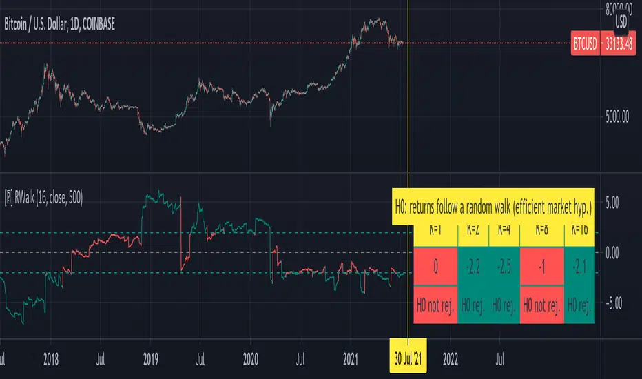 - results form the statistical tests on different K's in the table on the right/bottom side of the chart (H0 rejected = not random walk; H0 not rejected = it essentially looks rather random and we can't conclude that it's not a random walk)