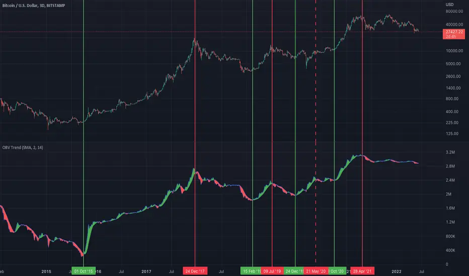 "OBV Trend" is a trend strength indicator, that can be used to identify strong trends and also trend changes based on volume.