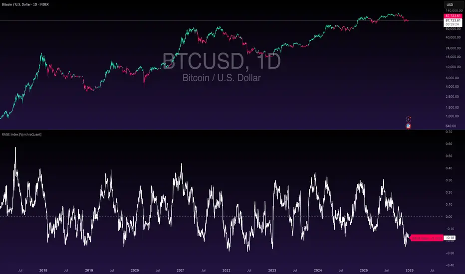 The RAGE Index is a quantitative momentum oscillator that measures the efficiency and quality of an asset's price trend. Standing for Risk-Adjusted Geometric Exponent, this indicator goes beyond simple price action by evaluating the average logarithmic growth rate relative to the asset's volatility.