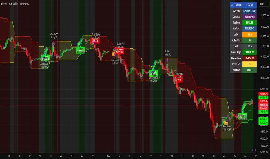 The original Turtles used Donchian Channels—a simple concept where you track the highest high and lowest low over a specific lookback period. This strategy implements both original Turtle systems: