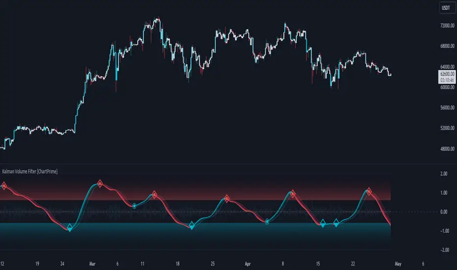 The "Kalman Volume Filter", aims to provide insights into market volume dynamics by filtering out noise and identifying potential overbought or oversold conditions. Let's break down its components and functionality: