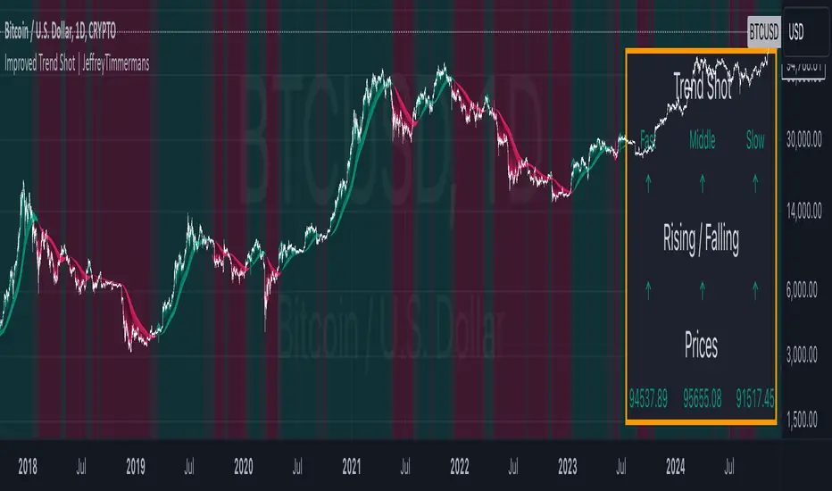 The "Improved Trend Shot" is an advanced trend-following tool that integrates cutting-edge features and the principles of John Ehlers’ SuperSmoother Filter to provide traders with more accurate trend detection and better decision-making. This enhanced version includes multiple smoothing types, customizable lengths, dynamic alerts, and a comprehensive dashboard to help traders quickly interpret market conditions.