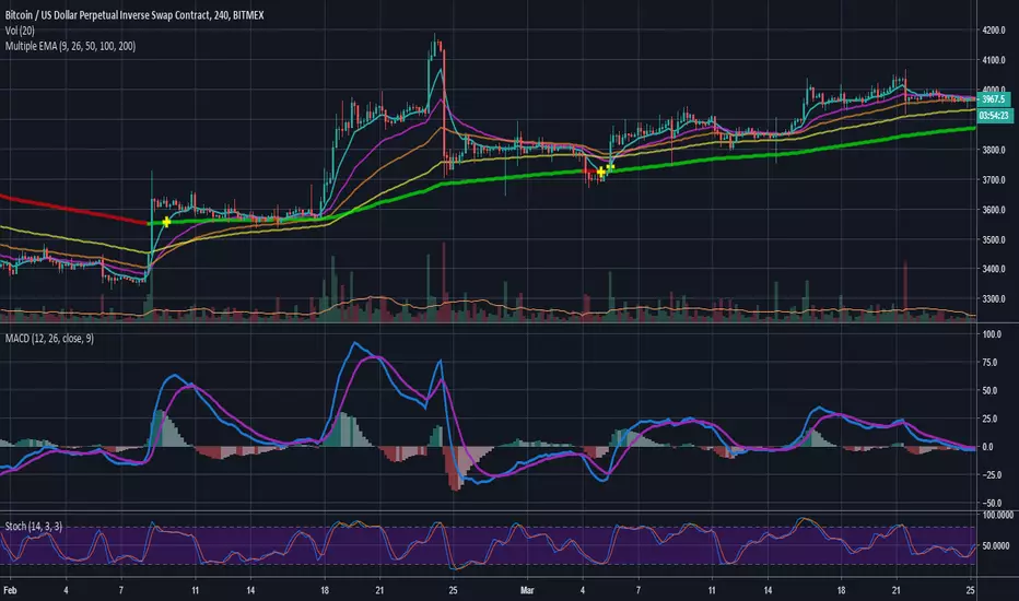 Multiple EMA. Color switch of slowest EMA (def=200) when price close below or above. Trend marker when fastest EMA (def=9) cross slowest EMA (def=200).