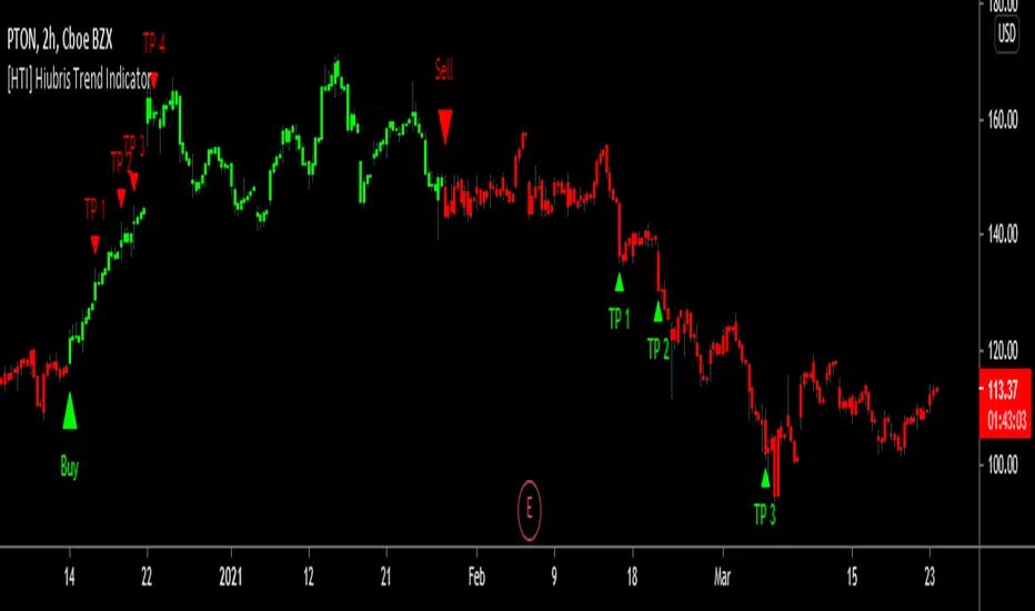 Hiubris Trend Indicator is very profitable on higher timeframes (45min, 2h, 4h) - It can also be used on lower timeframes, together with another HigherTimeframe Trend indicator, acting as a filter for the alerts (Ex: [HLTT] Hiubris Long Term Trend)