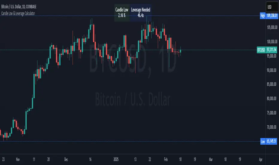 The Candle Low Leverage Indicator is a powerful tool for long position traders seeking to manage risk effectively when using leverage. By evaluating the current candle's low price, this indicator helps traders make more informed decisions about potential entry points, stop losses, and leverage levels. The indicator matches the low of the candle to the leverage needed for liquidation, giving you a clear view of how leverage impacts your position.