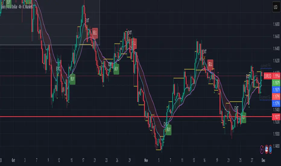 This indicator is based on slow and fast EMA, like regular EMA cross, but updated. It works the best on trendy pairs like EU, and works the best on 4h time frame. It shows where to entry and where to close the position based on slow EMA. It can be used like additional confluence with FTB entry model, and whole strategy.