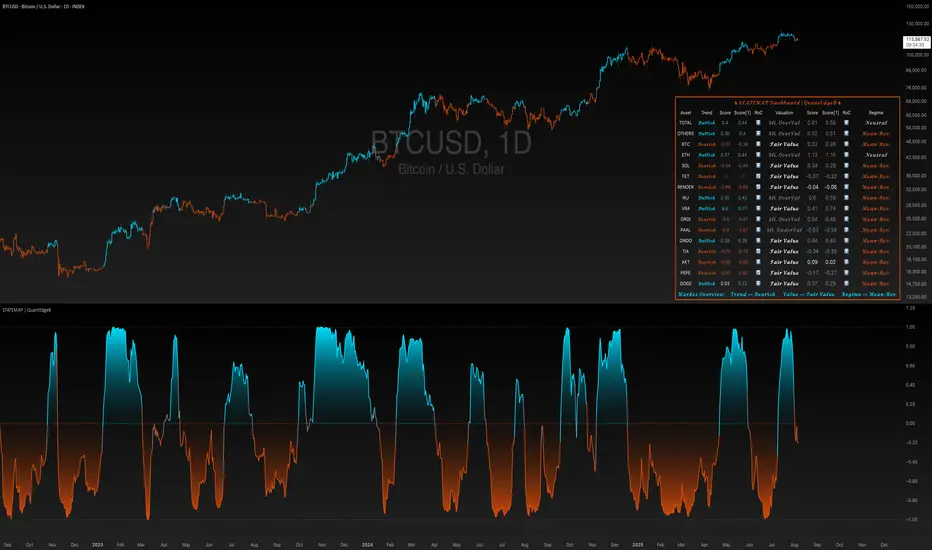 STATEMAP | QuantEdgeB is a holistic Trend & Valuation dashboard for 16 key crypto and index assets. It distills each asset’s momentum regime and valuation state into two live averages—trend average and valuation average—and presents them via color-coded candles, dynamic plots, and a comprehensive bottom-right table. Switch effortlessly between Trend and Valuation views to spot regime shifts across the market.