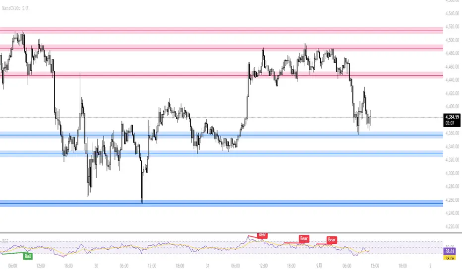 该指标通过识别价格的高低点来绘制支撑(S)和阻力(R)线及区域,帮助交易者识别潜在的价格反转区域。