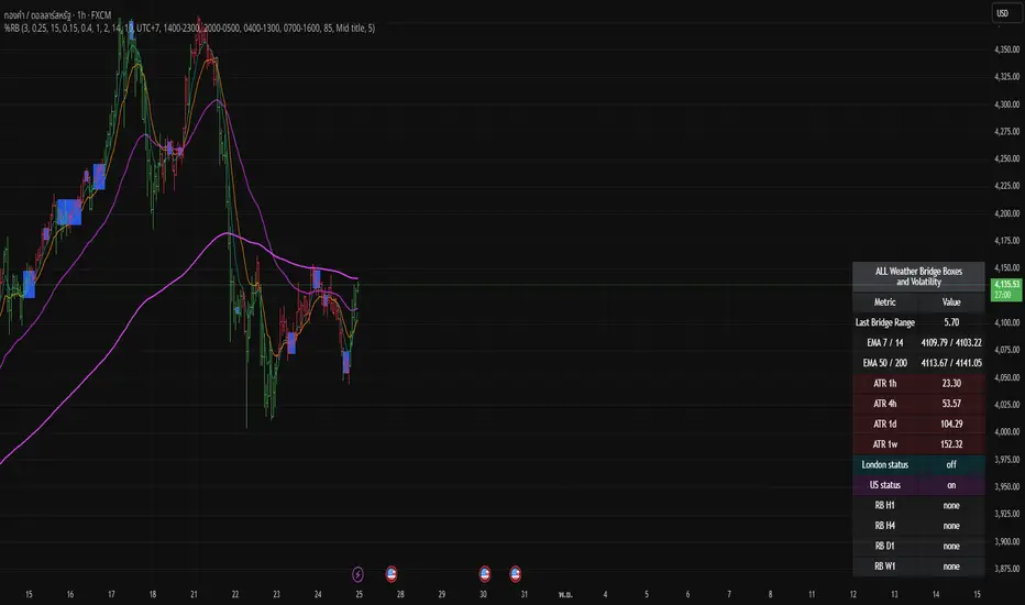 Bridge Boxes: detect compression when N consecutive B-bars occur (|close−open| ≤ ε%). Draw box and store latest top/bottom.% Range Breakout (RB): compute mid = (top+bottom)/2 from last TOOLBAR box, freeze refClose = close[1], build up/down levels by TF-specific % (H1/H4/D1/W1). Trigger on cross; draw RB line/label; auto-clear next confirmed bar if no new break.