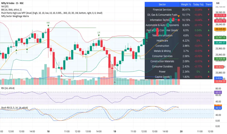 Sector-weighted view of the Nifty 50 index. This script highlights how much each sector contributes to the index along with real-time sector trend. Essential for index traders looking to understand sector impact, rotations, and leadership.