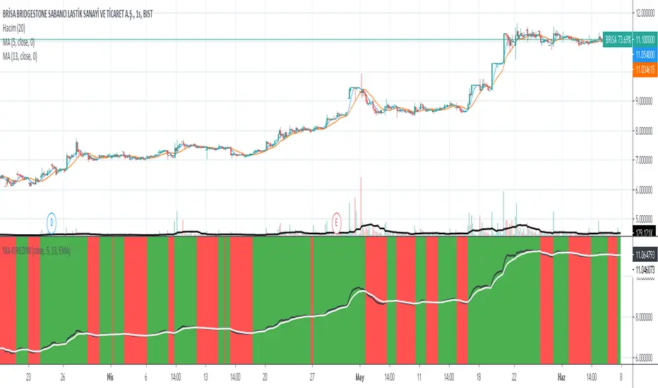 When MA1 breaks MA2 up, the background color turns green or otherwise, the background becomes red. If you want, you can follow the lines of moving averages in here.