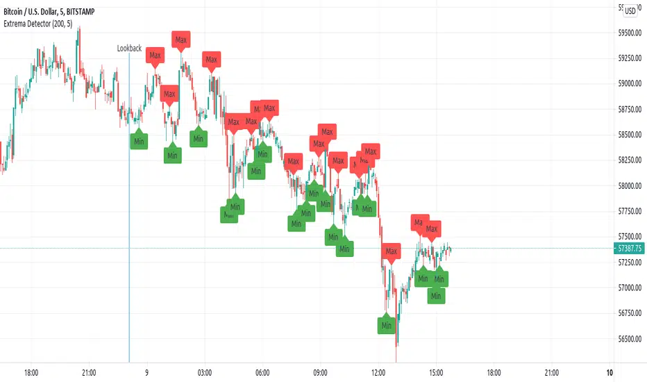 Is a lagged indicator: determining if the current candlestick have reach a maximum can be delayed to, at most extrema_finder_sensivity-further candlesticks.