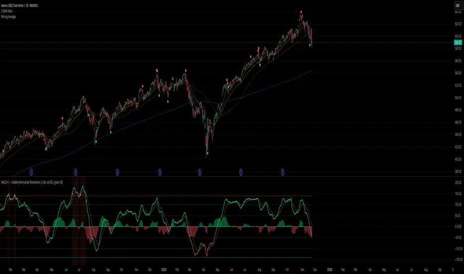 🟢 Green Dot (Bullish Reversal): Appears when a panic phase ends. It triggers when the 3-DMA Decliners crosses back under the 65% panic threshold, but only if the market was Oversold (SMI < 0) at some point during the panic. This "latch" logic ensures you catch the reversal even if momentum shifts slightly before the panic fully subsides.