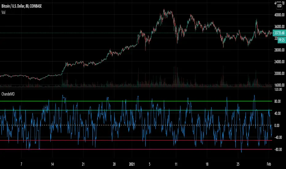 It seemed weird to me that the default Chande didn't have overbought and oversold regions, despite them being described for Chande Momentum and working very well. So I added the lines and alert conditions. I've used this to very good results in my day trading.