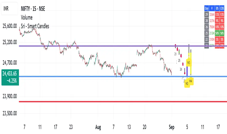 The Sri - Smart Candles indicator allows traders to visualize historical and current daily and weekly candles on a single chart in a compact and customizable format. You can choose between Normal candles or Heikin Ashi candles for better trend visualization. The script displays previous 4 candles, the last candle, and the live candle with horizontal offset positioning to avoid overlapping the chart. Additionally, the indicator includes customizable labels for days or week numbers, helping traders quickly analyze patterns and trends.