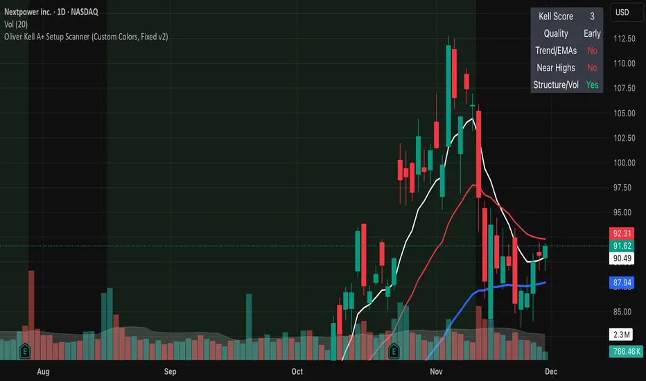 Designed to help swing traders quickly identify leader stocks forming high-probability breakout structures inspired by Oliver Kell’s super-performance methodology. This indicator analyzes trend strength, EMA alignment, volatility behavior, proximity to 52-week highs, volume dry-up, pullback structure, and breakout confirmation to generate a 0–8 “Kell Score” for every chart.