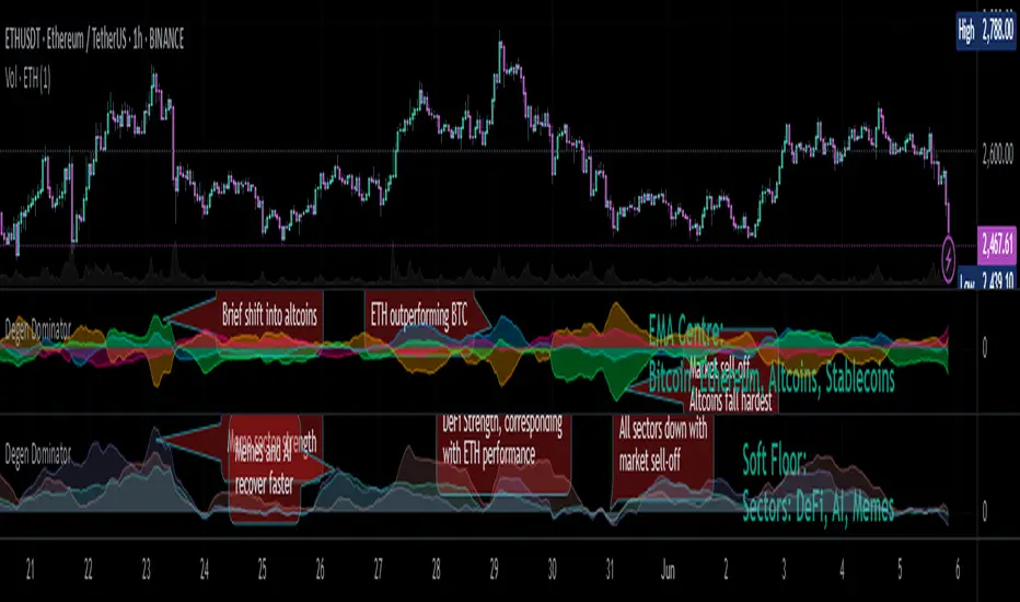 The four primary dominance oscillators remain as before however the altcoin and stablecoin percentages have been recalculated making use of the new 'TOTALES' and 'TOTAL3ES' indices to give more accurate calculations.