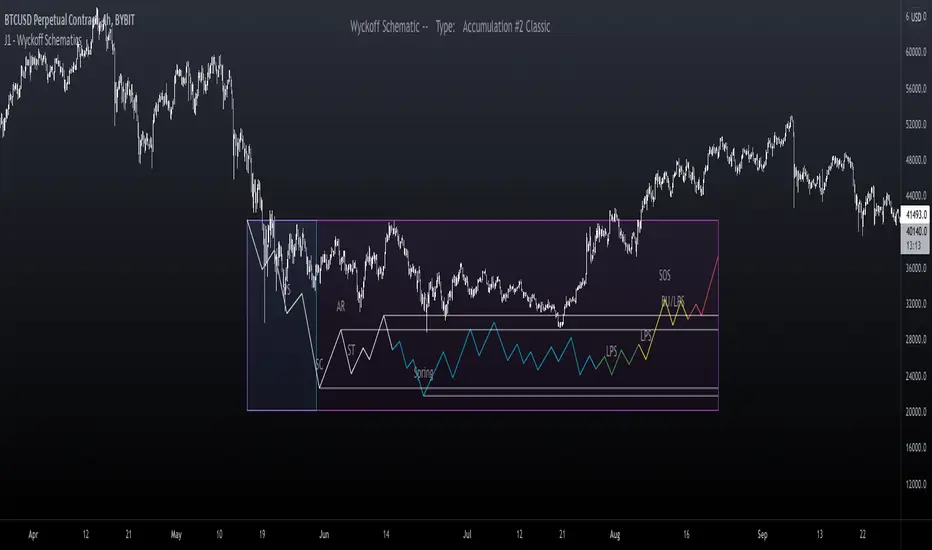 The main idea of this script is purely an overlay of the Wyckoff schematics (Accumulation/Distribution) on top of your chart, which can help you to analyse trends or potential future market structures.