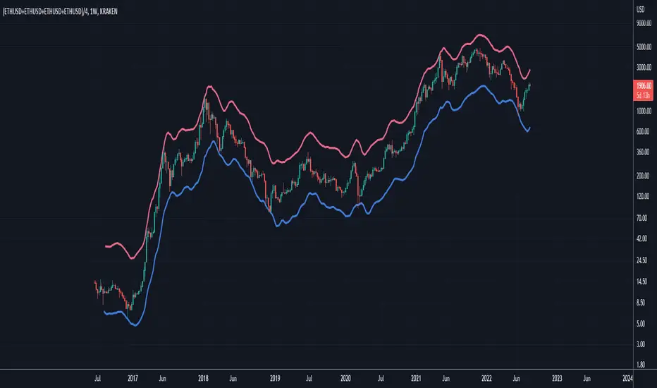 Similar to "Bitcoin: Confidence Bands", this script is designed to show regions of positive and negative overextension for Ethereum, where price is expected to either reverse long-term or at least shorter-term, using custom price loops tuned for the Ethereum case. Again, the idea is that one can be highly confident that Ethereum's price stays within the Confidence Bands, especially when looking at weekly closes. It might be wise to reduce exposure to Ethereum when price gets very near to the red band, and vice versa for an approach of the blue band. Of course this constitutes no financial advice, and one should always consider all available information for making trading decisions.
