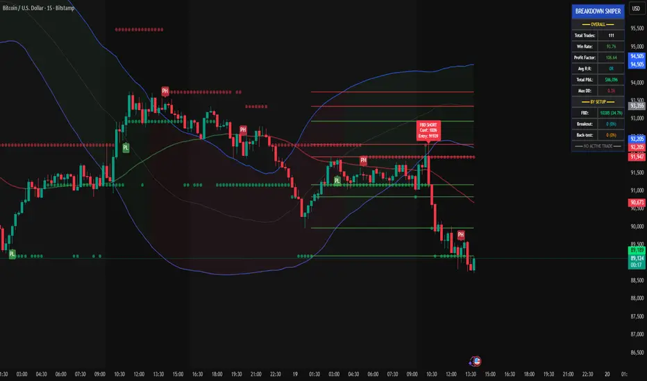 Breakdown Sniper continuously detects pivot highs and lows using user-defined left/right bars.