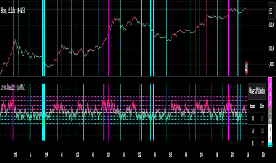 The Universal Valuation indicator is a sophisticated composite analysis tool that combines multiple technical indicators, statistical measures, and risk ratios to provide a comprehensive assessment of asset valuation across all market conditions and timeframes.