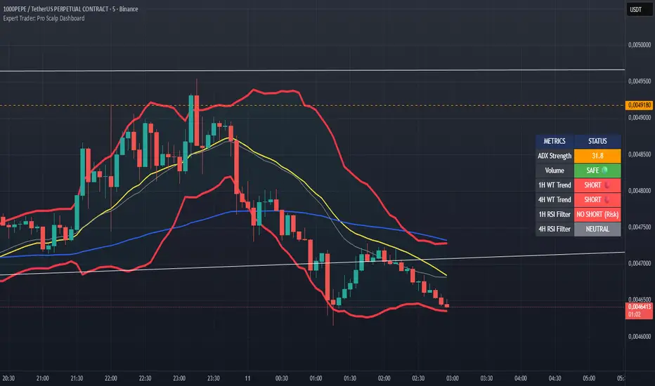 Alerts: Displays "NO LONG (Risk)" or "NO SHORT (Risk)" if the 1H or 4H RSI indicates overbought or oversold conditions, protecting you from buying tops or selling bottoms.
