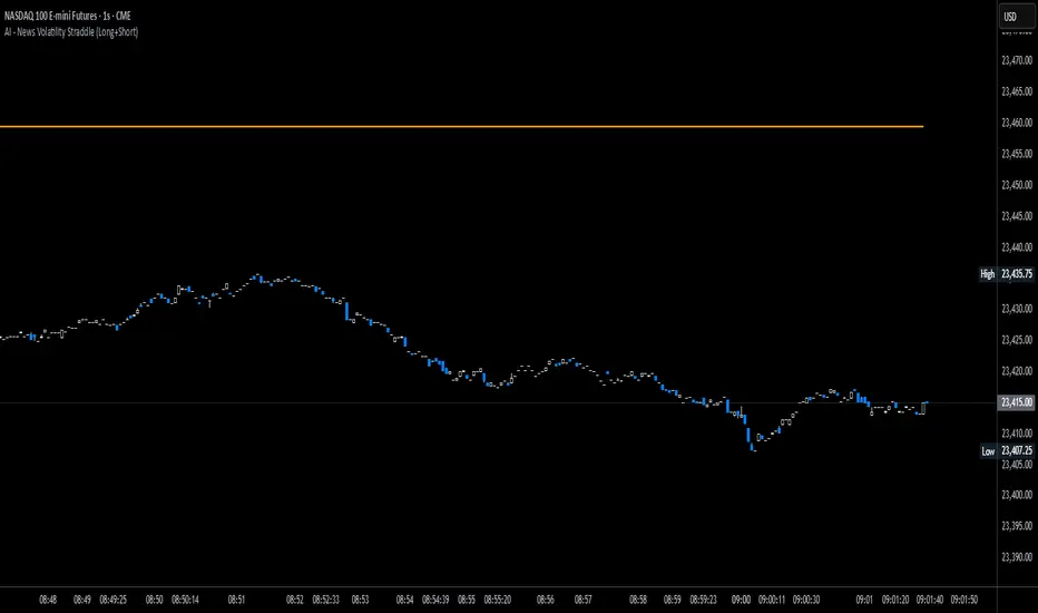This is a news-volatility bracketing strategy. Five seconds before a scheduled release, the strategy brackets price with a buy-stop above and a sell-stop below (OCO), then converts the untouched side into nothing while the filled side runs with a 1:1 TP/SL set the same distance from entry. Distances are configurable in USD or %, so it scales to the instrument and can run on 1-second data (or higher TF with bar-magnifier). The edge it’s trying to capture is the immediate, one-directional burst and liquidity vacuum that often follows market-moving news—entering on momentum rather than predicting direction. Primary risks are slippage/spread widening and whipsaws right after the print, which can trigger an entry then snap back to the stop.