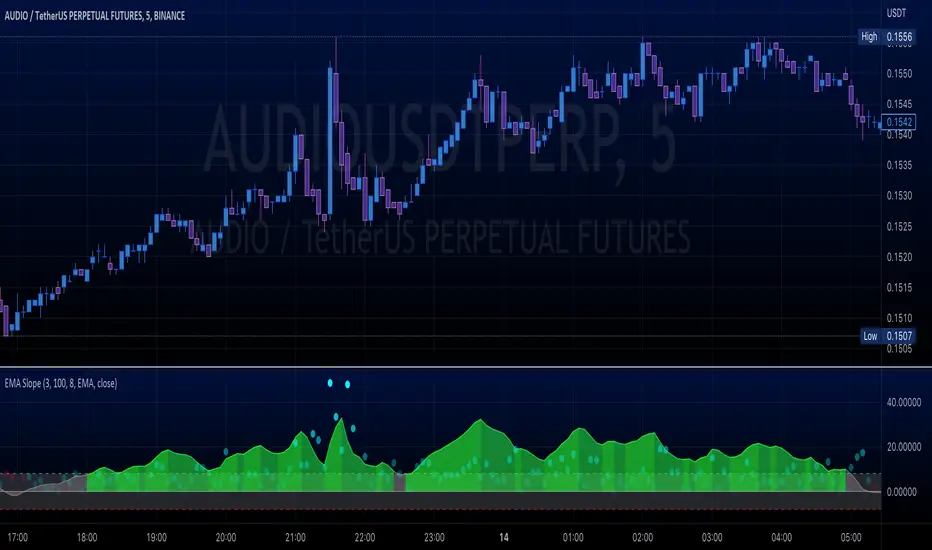 The EMA slope, or Exponential Moving Average slope, is an indicator commonly used in technical analysis to identify and assess market trends. It measures the rate of change or the slope of the Exponential Moving Average line.The Exponential Moving Average is a type of moving average that places more weight on recent data points, making it more responsive to recent price changes. The EMA slope is derived from the EMA line by calculating the difference between the current EMA value and the EMA value from a certain period ago.