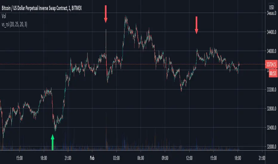 This script calculates volume spikes (e.g. volume is 3 times greater than average volume) and signals them in overbought or oversold areas (RSI).