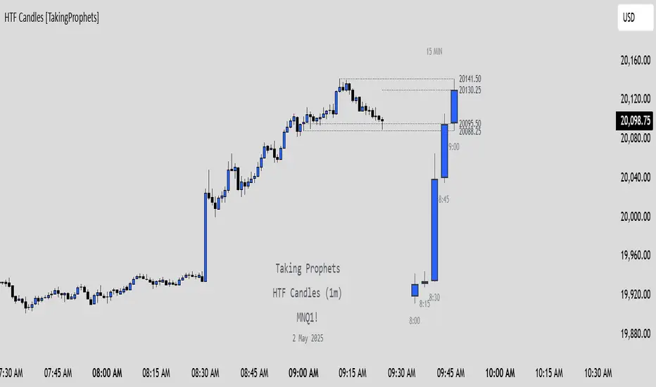 HTF candle visualization (up to 10 candles, optional right-side offset) with bodies, wicks, and time labels.