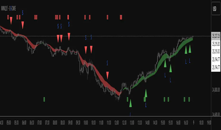 This indicator combines EMA trend structure with Stochastic momentum extremes to generate clean, high-probability entry confirmations — visualized through a dynamic color-filled ribbon.