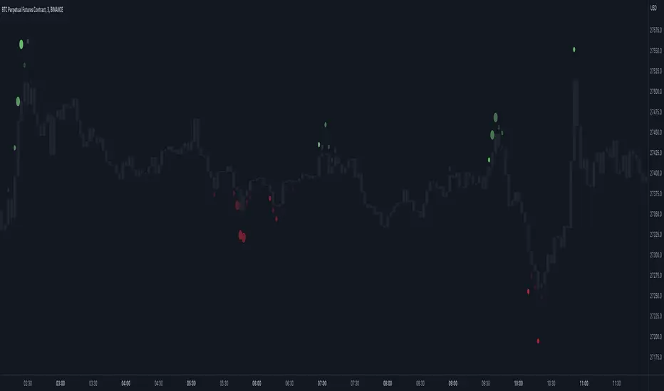 I created Market Order Bubbles six months ago as an additional tool included in my Liquidation Levels script. Due to their popularity, I decided to publish them as a standalone indicator with some new features. The script is based on a calculation that uses volume data (imitation of CVD) and price action to estimate where there is a surge in the quantity and magnitude of market buy and sell orders. These occurrences are visualized with circles (bubbles) that appear above the bar (market buy orders) or below the bar (market sell orders). Most of the time, the approach to interpreting the bubbles is contrarian, meaning that the appearance of Market Buy Order Bubbles can serve as a confluence to look for shorts, and the appearance of Market Sell Order Bubbles can serve as a confluence to look for longs.