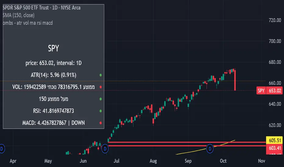 אינדקטור ombs – atr vol ma rsi macd מציג תצוגה חזותית קלה לשימוש של נתוני דשבורד יומיים עיקריים - טווח ממוצע יומי (ATR), ווליום (VOL), ממוצע נע 150, העצמת RSI ו-MACD. העיגולים הצבעוניים מחליפים צבעים לפי חוזק או חולשה במדדים המרכזיים. אידיאלי לאנליסטים וסוחרים שרוצים לראות תמונת מצב טכנית בבת אחת במסך.