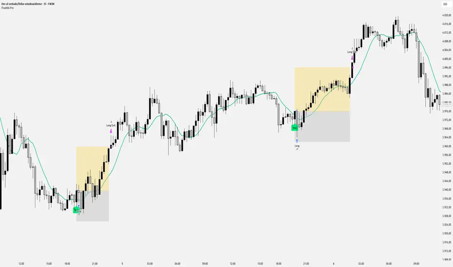 FluxMA is a backtesting strategy based on price breaking through a configurable moving average. Its purpose is to provide a simple, transparent, and flexible framework to study a trend-following system with clear entries, predefined Stop Loss and Take Profit levels, and no martingale, no grid, and no hidden logic.
