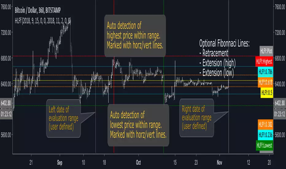 Auto detect highest/lowest price within a range of bars. The range is user defined by selecting a fixed date (timestamp) for the left and right endpoints. As new bars appear in the chart, the endpoints do not move (thus "fixed" in time).