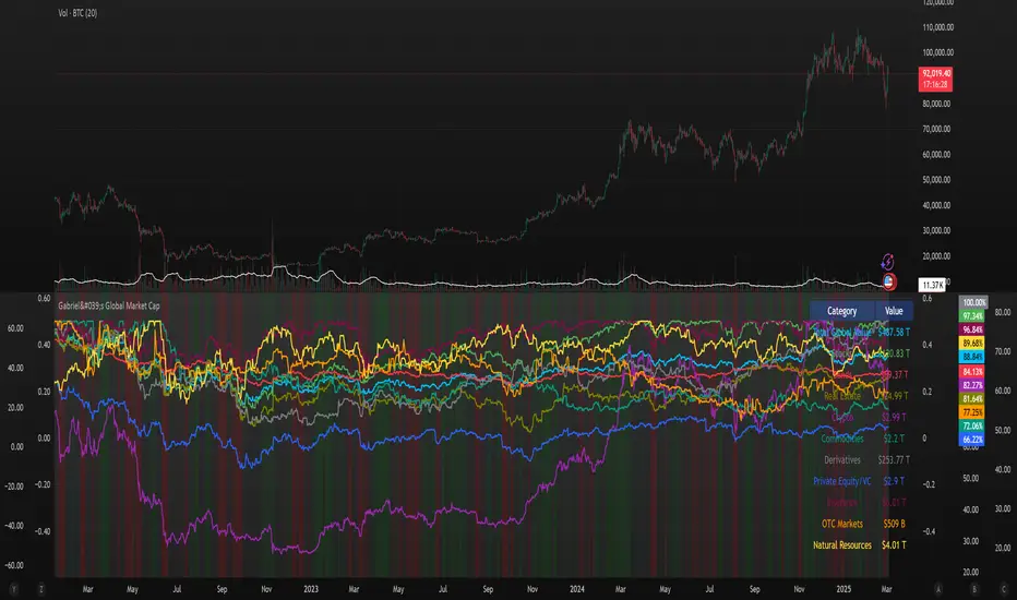 Gabriel's Global Market Cap is a comprehensive financial indicator designed to track and analyze the total market capitalization across multiple asset classes. It incorporates various financial markets, including stocks, bonds, real estate, cryptocurrencies, commodities, derivatives, private equity, insurance, OTC markets, and natural resources, to provide a holistic view of global market dynamics.