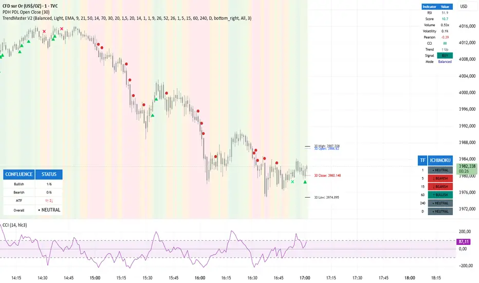 TrendMaster V2 is a comprehensive multi-factor technical analysis system designed to provide a clear visual summary of market conditions across multiple timeframes.