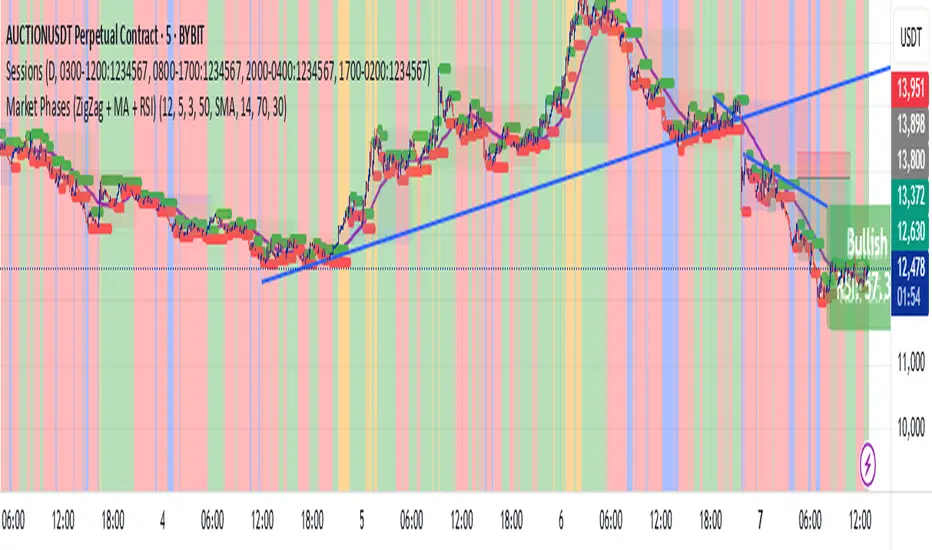 This script is a TradingView Pine Script that visualizes market phases using the ZigZag pattern, Moving Averages (MA), and the Relative Strength Index (RSI). It allows traders to identify key market conditions, such as accumulating, distributing, bullish, and bearish phases based on price movements and momentum indicators.