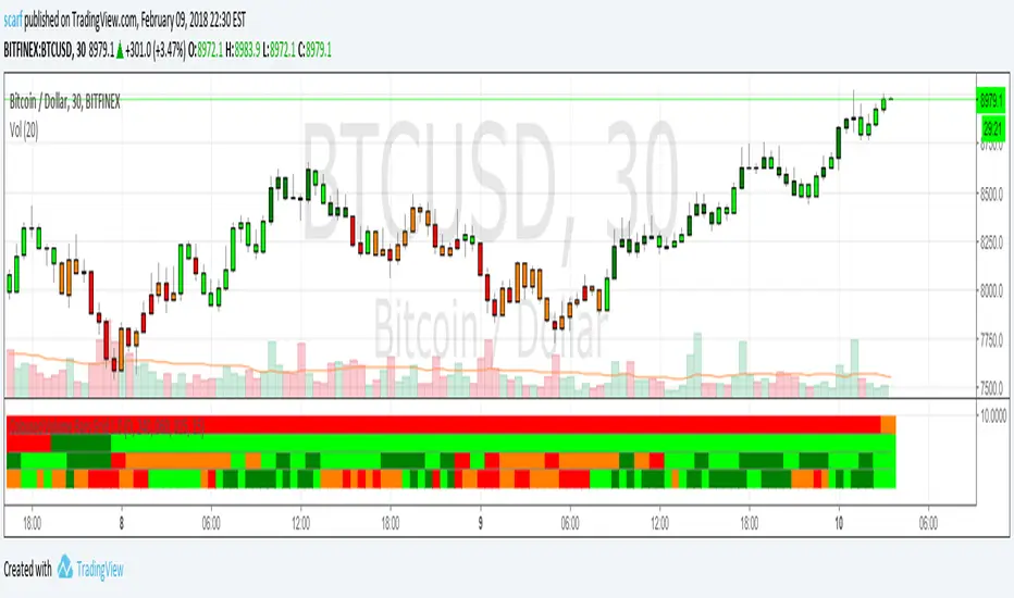 The above logic in itself gives pretty remarkable considering how simple the idea is. I have added a multi-timeframe feature where the same logic is applied to 4 other timeframes. This way you can quickly be aware without having to check. There are four layers and the default settings show (from top to bottom) daily, 4h, 1h and 15m