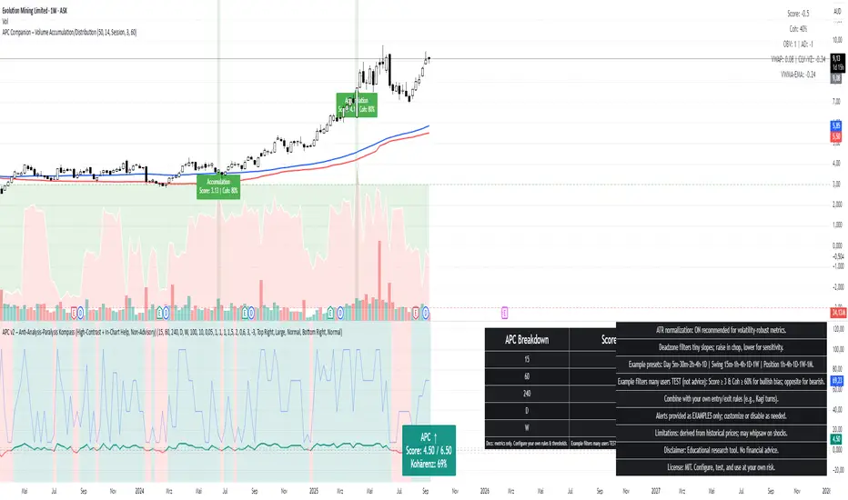 The APC Companion measures whether markets are under Accumulation (buying pressure) or Distribution (selling pressure) by combining: