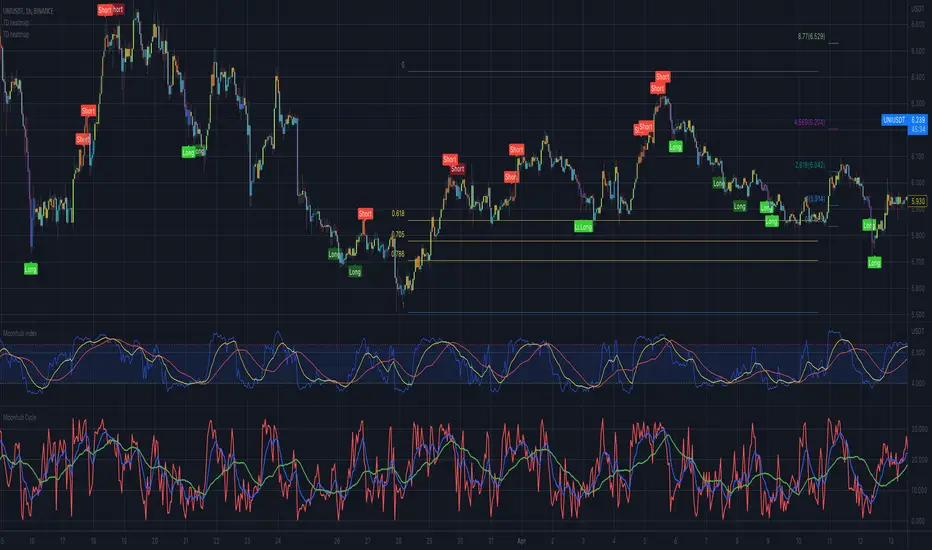 Moonhub Cycle Index is a composite index derived from three popular technical analysis indicators: Moving Average Convergence Divergence (MACD), Schaff Trend Cycle (STC), and Detrended Price Oscillator (DPO). The indicator is designed to help identify potential trends and market sentiment by combining the unique characteristics of each indicator.