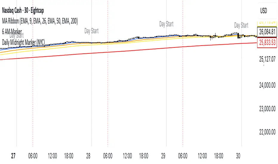 Daily Midnight Marker (NYC) automatically plots a vertical light-gray line on your chart at midnight New York time (00:00) to visually mark the start of each trading day.