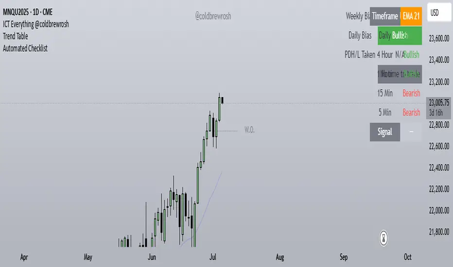 This script is designed to identify potential buy and sell trading opportunities based on 21 EMA (Exponential Moving Average) break and retest patterns, with confirmation from multi-timeframe trend analysis. It combines actionable signal generation with a clean, real-time trend overview table.