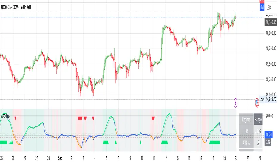 ARO Pro — Adaptive Regime Oscillator (v6)ARO Pro turns your chart into a context-aware decision system. It classifies every bar as Trending (up or down) or Ranging in real time, then switches its math to match the regime: trend strength is measured with an ATR-normalized EMA spread, while range behavior is tracked with a center-based RSI oscillator. The result is cleaner entries, fewer false signals, and faster reads on regime shifts—without repainting.