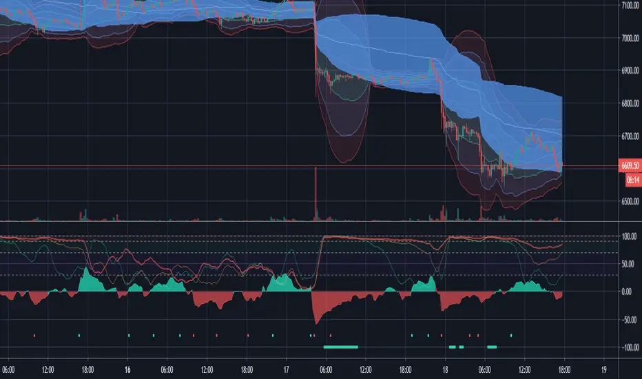 The second part of the indicator consists of the top 3 lines osculating between 0 and 100. This part of the indicator measures the markets expansion and volatility allowing us to spot early exhaustion during trend. The indicator consists of three lines and when all 3 read over 95 we can begin looking for a bottom or reversal. Its secondary area are the solid lines (green/red) at the bottom of the indicator to make spotting these potential areas easier and to keep an eye on the market/orderbook/other indicators to spot the exhaustion.