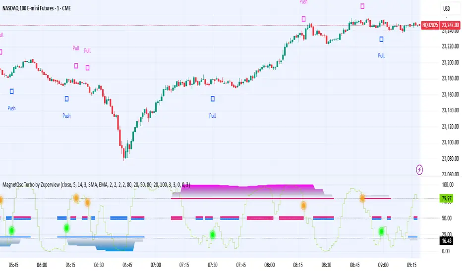 Unlike conventional oscillators, MagnetOsc Turbo analyzes momentum on two independent timeframes simultaneously (e.g., 100-tick & 5-minute).