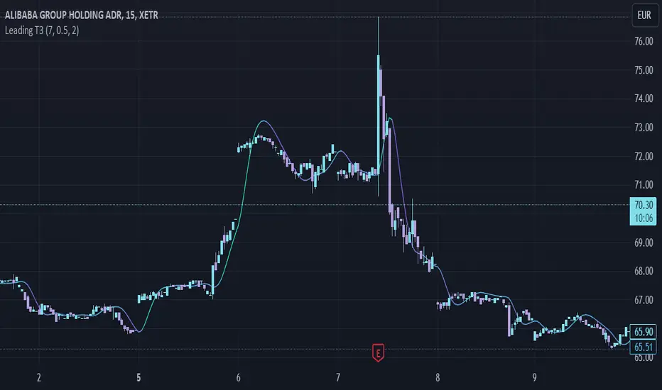 Here, I applied a special technique of John F. Ehlers to make lagging indicators leading. The T3 itself is usually not realling the classic lagging indicator, so it is not really needed, but I still publish this indicator to demonstrate this technique of Ehlers applied on a simple indicator.