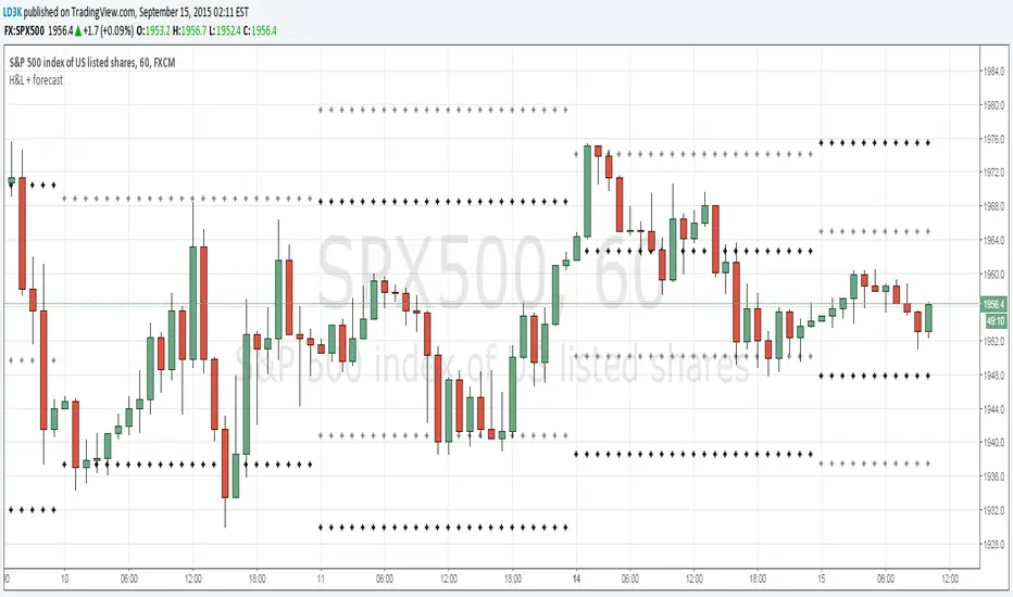Plots the previous periods High and Lows (black crosses) and forecasts the next day's High and Lows (gray crosses)
